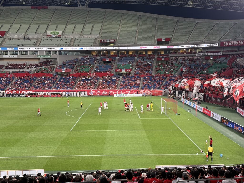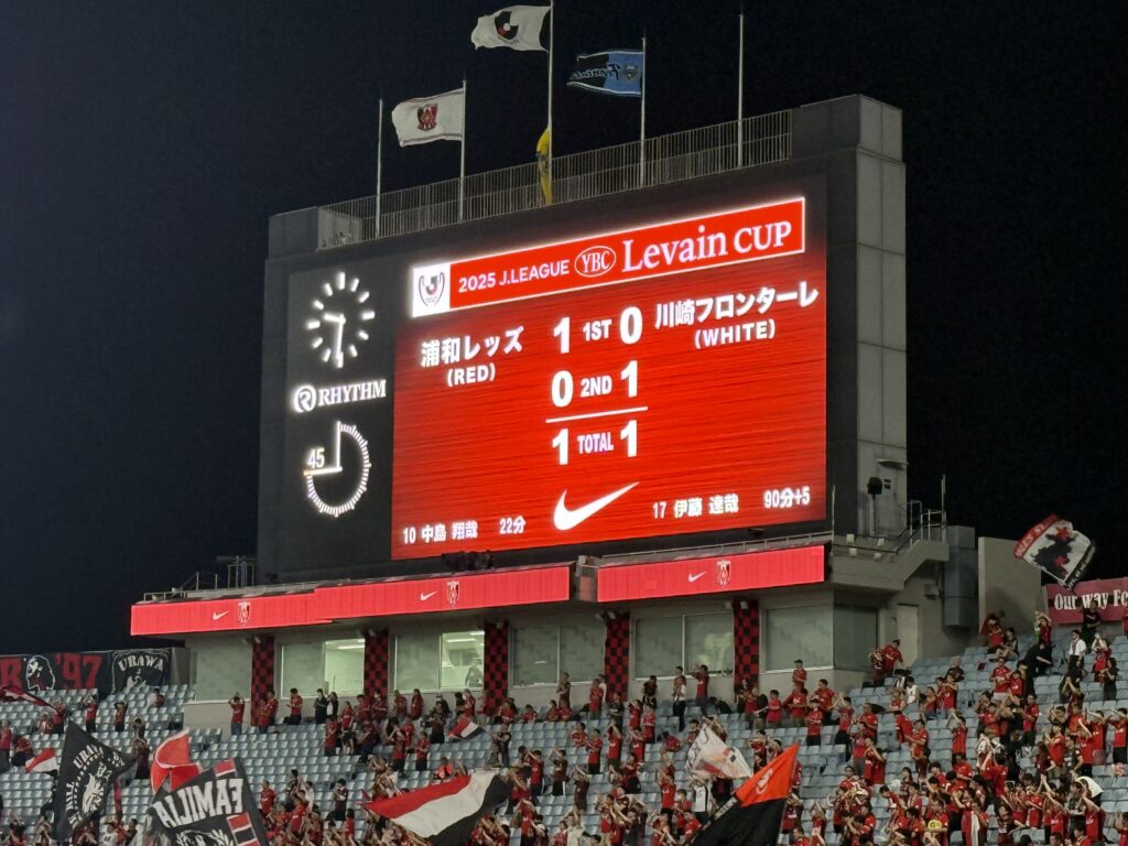 - そんな中、試合終了が近づき、スタジアムにいるレッズサポーター全員が勝利を確信た瞬間、まさに一瞬の隙を突かれます。90+5分、ラストワンプレーで川崎の伊藤達哉選手に同点ゴールを許し、土壇場で追いつかれてしまう展開に。そのまま1-1でタイムアップ。